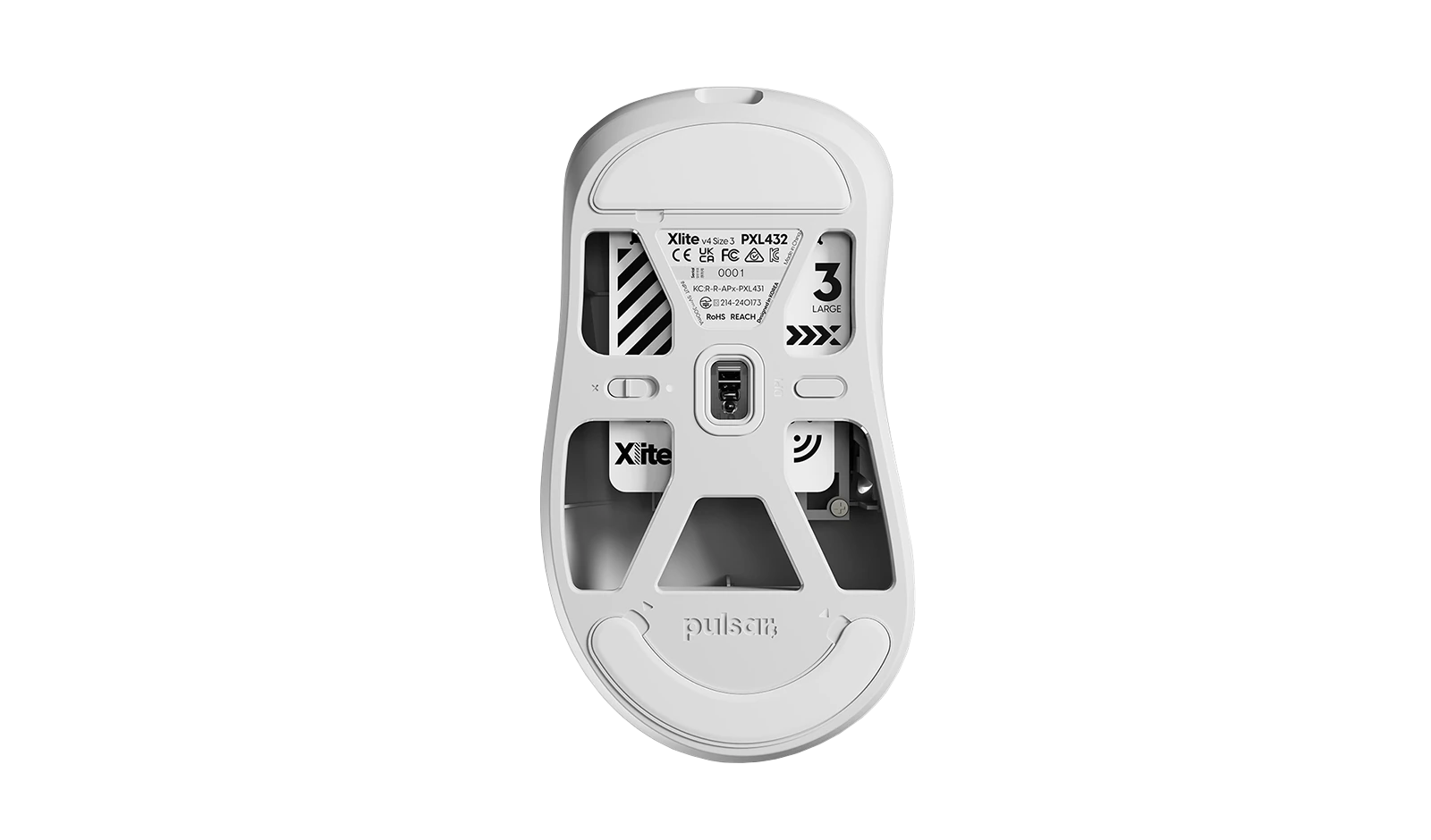 De Pulsar Xlite V4 Large heeft een ultralichte behuizing van slechts 58 gram, met afmetingen van 69,5 mm breed, 126,6 mm lang en 44,5 mm hoog.