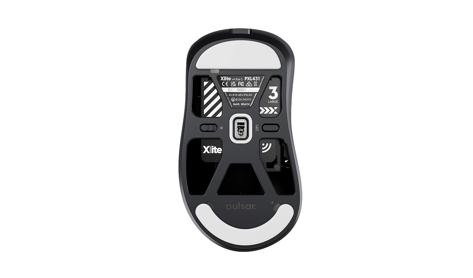 De Pulsar Xlite V4 Large heeft een ultralichte behuizing van slechts 58 gram, met afmetingen van 69,5 mm breed, 126,6 mm lang en 44,5 mm hoog.